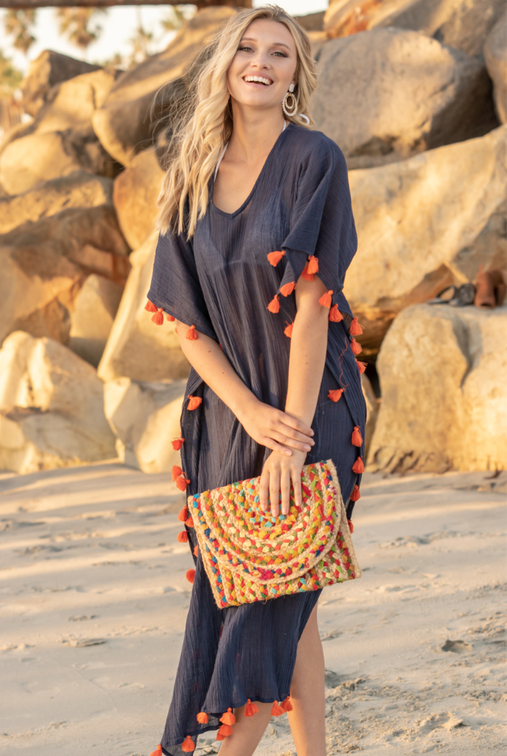 Our Positano Coverup is made with lightweight cotton gauze and a slit in each side for breathability and comfort. The gorgeous hand-made tassels adorn each side and dance in the sunlight as you walk your way to the pool!